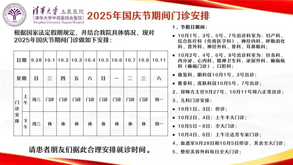 根据国家法定假期规定,并结合我院具体情况,现对2025年国庆节期间门诊做如下安排: